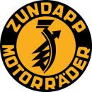 La zeta gótica fue el primer logo. Luego una circunferencia negra con el texto Zündapp Motorrader en naranja, al centro la zeta gótica negra sobre fondo naranja.